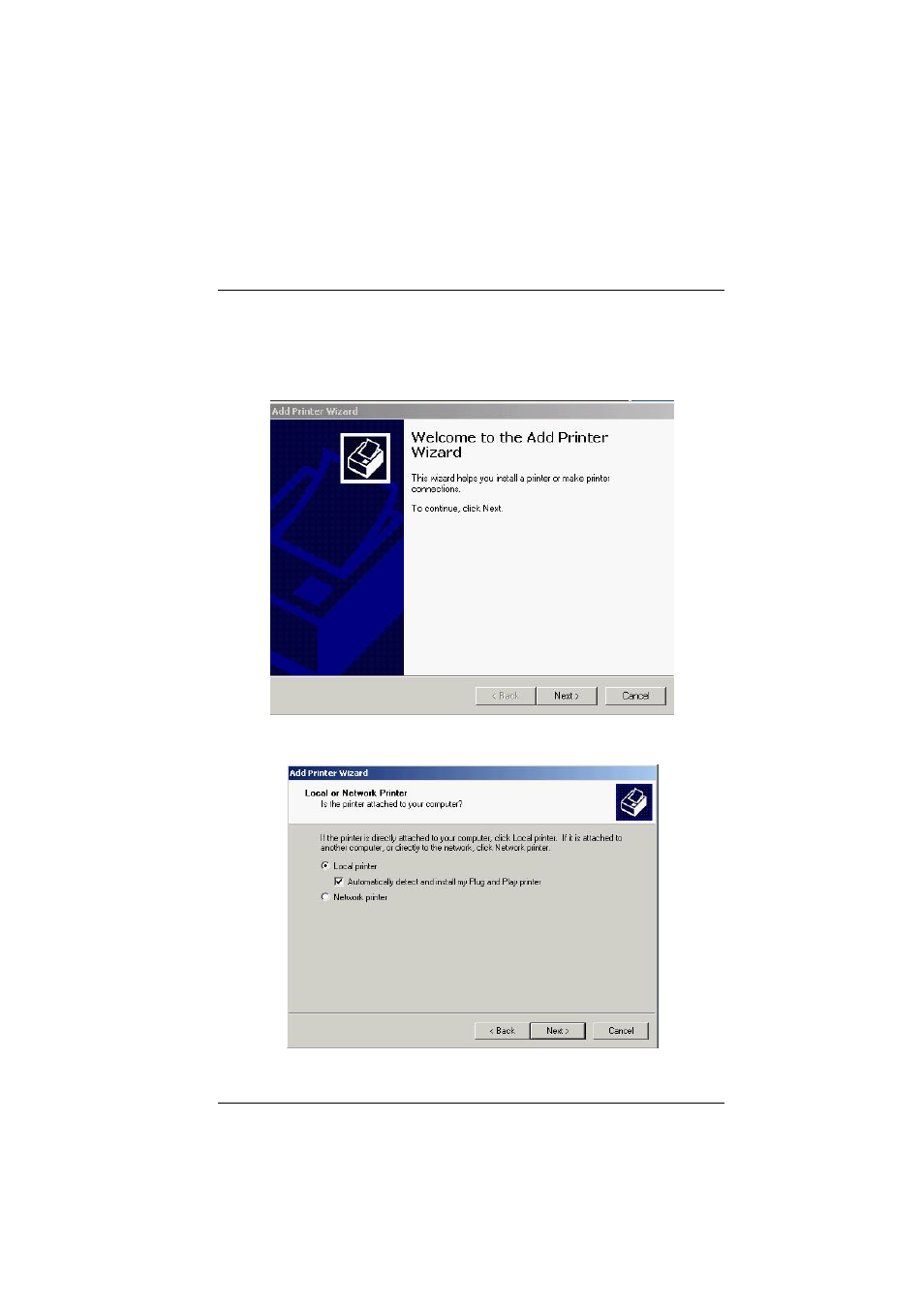 1. Go to “Start-Settings-Printers” on you PC. 2. Invoke the “Add Printer Wizard”. The following screen is