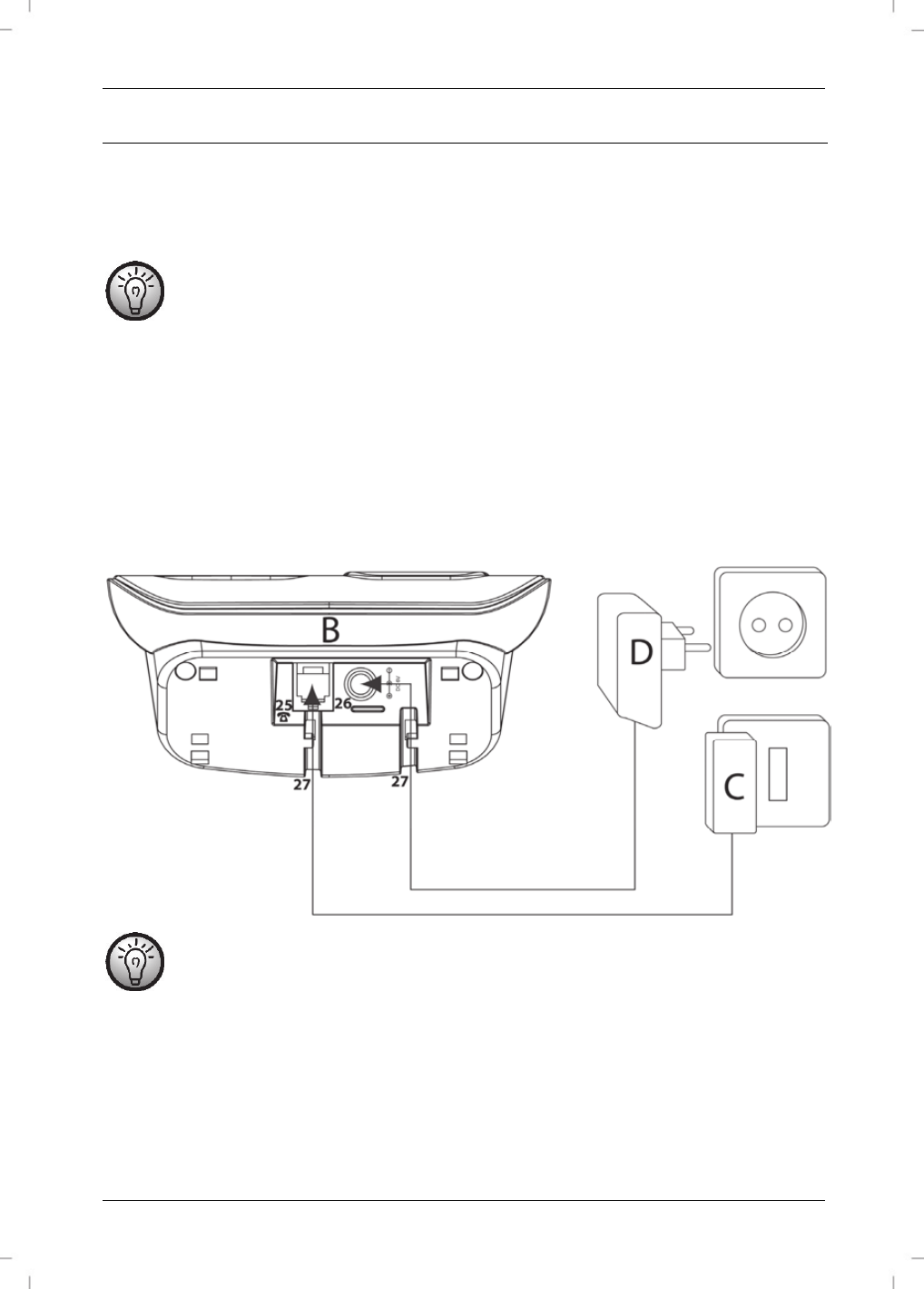 Collegare l’alimentatore [D] alla relativa presa [26] sulla parte inferiore della base [B].